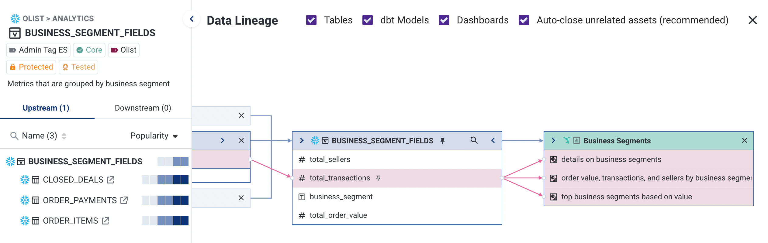 We are delighted to announce our new integration with ThoughtSpot! This integration allows you to view the metadata for all Liveboards, Answers, and all data objects in your ThoughtSpot environment, including tables, views, and worksheets. Additionally, you can explore the comprehensive lineage, both upstream and downstream, for all ThoughtSpot objects and your Data Warehouse tables.