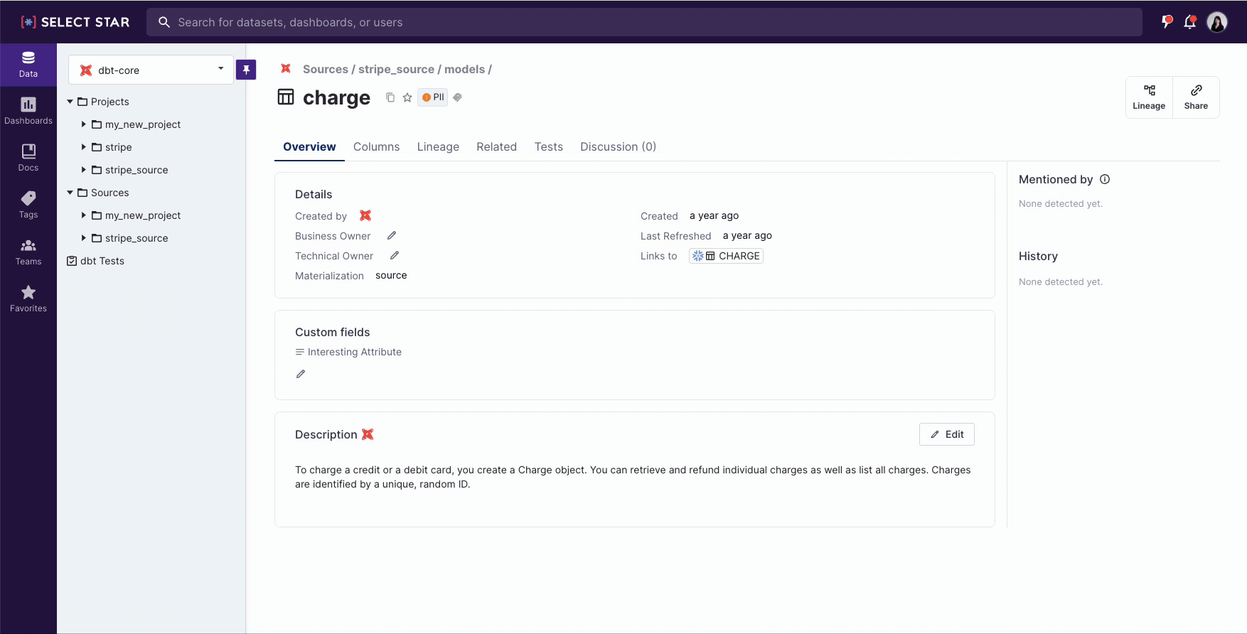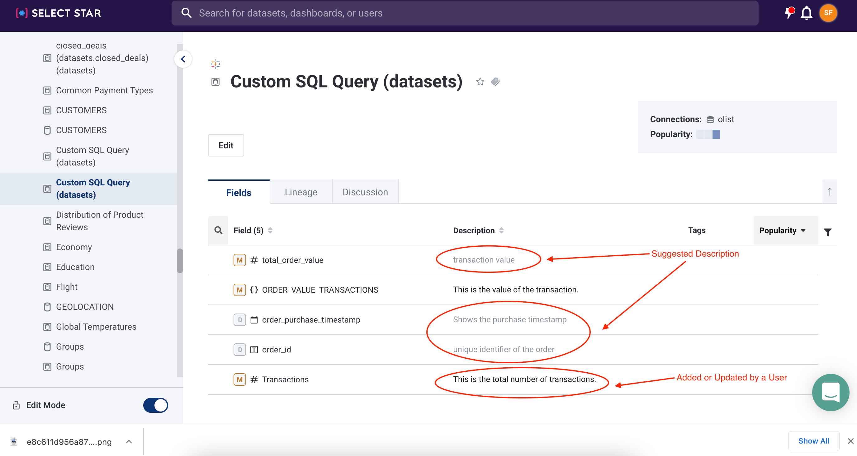Select Star works to ensure that if there could be a description for an object, there is. We do that by getting descriptions from users, from your data sources, and from suggested descriptions (upstream and downstream as-is lineage, similar tables, etc.).