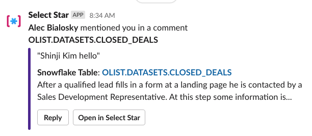 You can now use Select Star's search directly from Slack with our [Slack app](https://slackapp.selectstar.com/)! You can share search results quickly with other members of your team and get Select Star notifications when comments on your datasets or tags you.