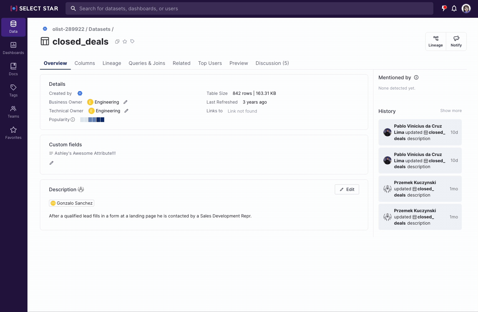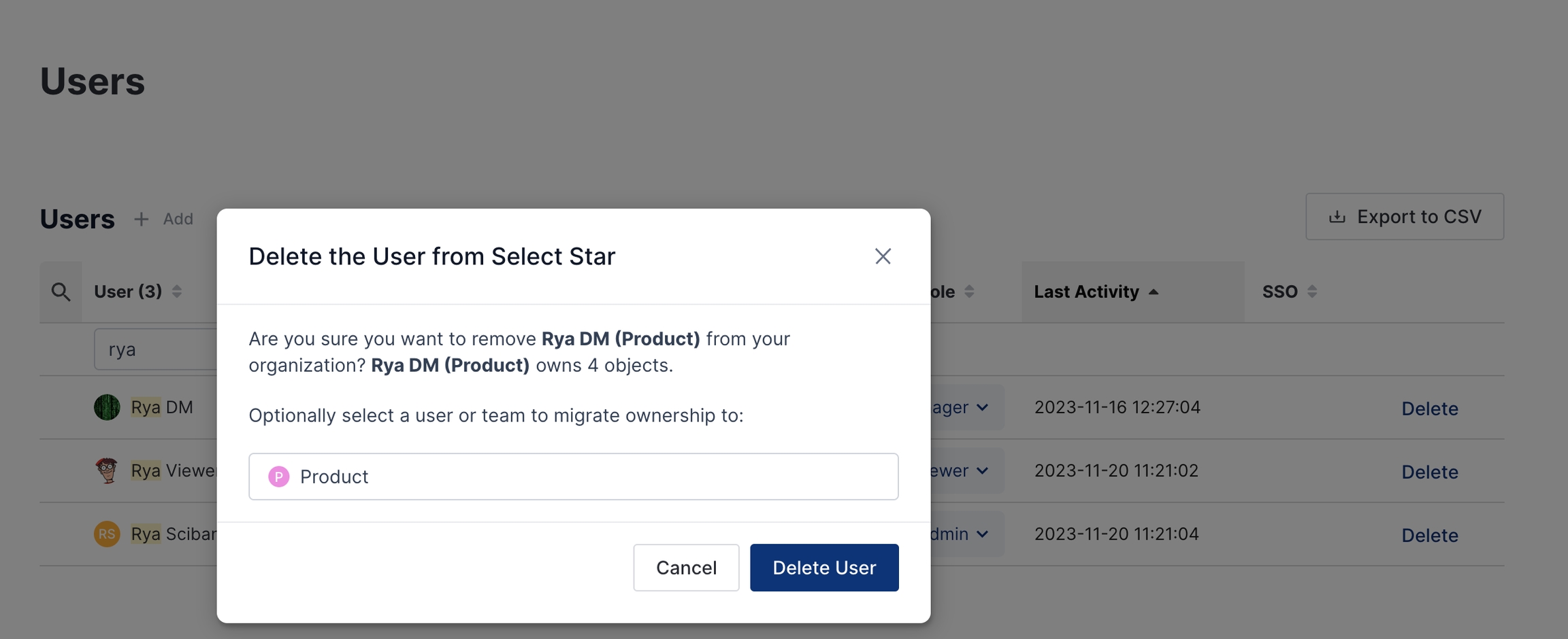 You've done the hard work of assigning owners for your key data assets, and now someone is changing roles or leaving the organization. Ownership migration helps you update ownership for key assets when removing users from Select Star. Now, when you are removing a user or a team, you have the option to select anewowner for all those assets.