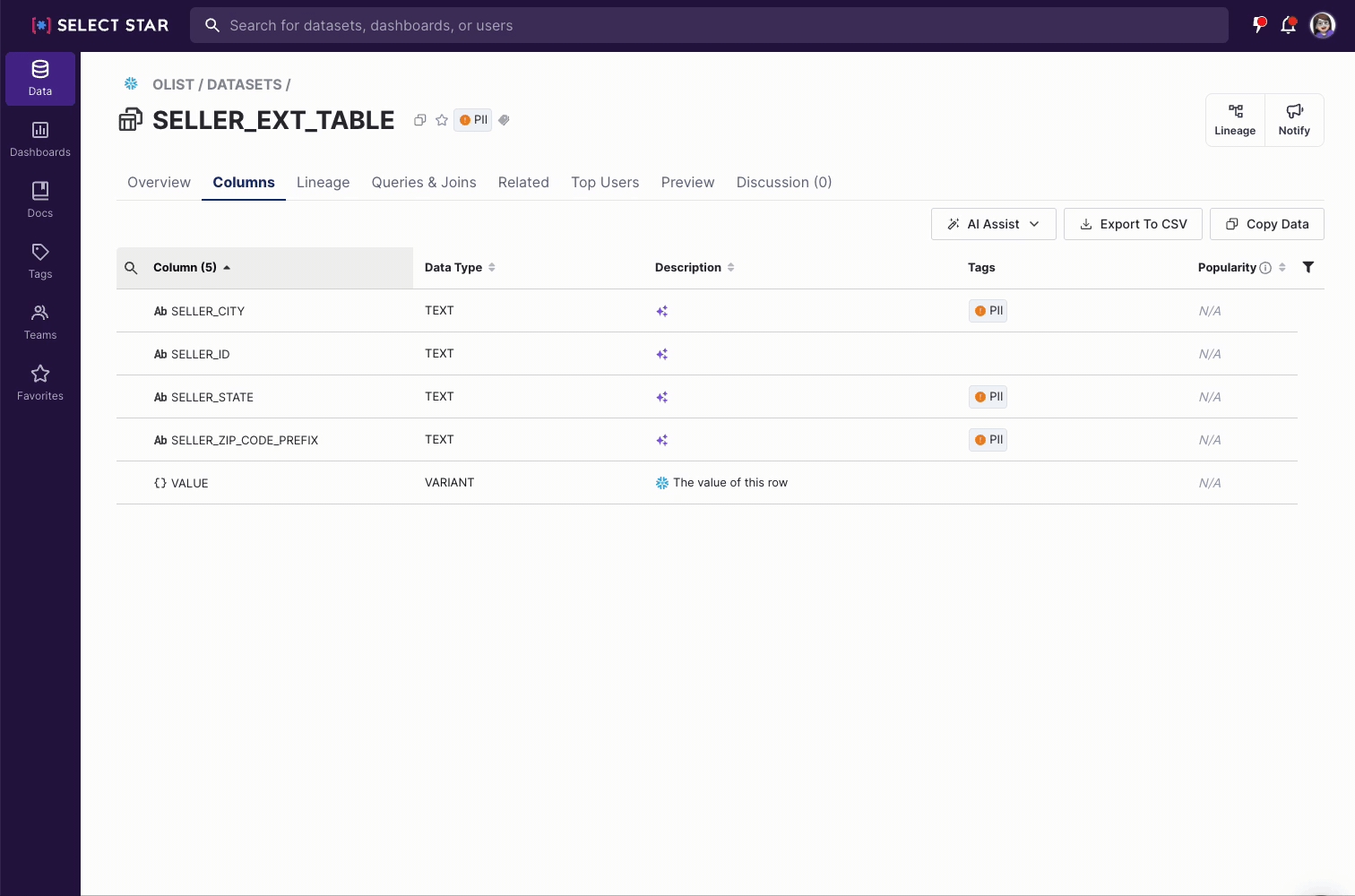 We've rolled out AI Assist for table columns and dashboard fields to help you document in bulk. Users can fill in all empty column descriptions in a table with a single button click. You can also remove all generated descriptions at once.