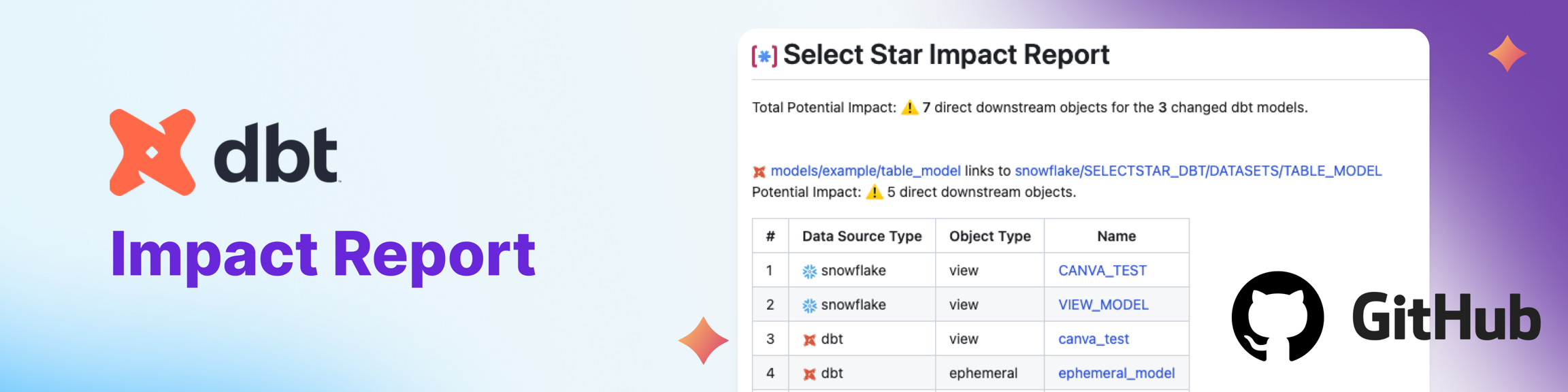 When you make a dbt model change, the Impact Report is generated as a comment in your PR, showing you what the downstream tables and dashboards are. Now you can check your downstream dependencies before they break.