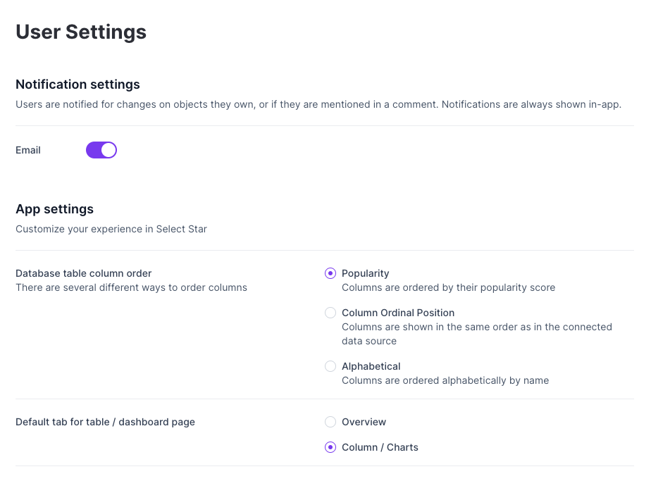 This new app settings also allows you to set the database table column order. By default, Select Star shows the columns ordered by popularity score. Now you can set the view to show the columns in your preferred order.