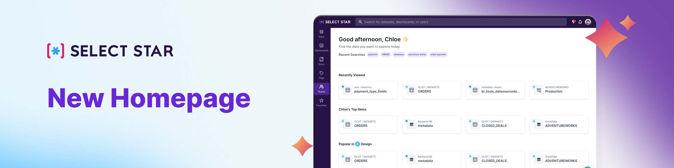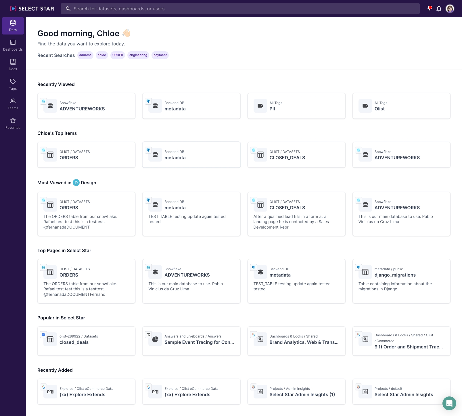 The homepage is the first thing users see when logging in to Select Star. Our latest homepage updates make it much easier for users to pick up where they left off, and see items that might be relevant to them.This revamped homepage consists of six main sections;