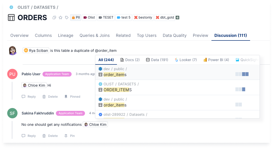 If you can't find an answer to your question, you can post the question on the [Discussion](https://docs.selectstar.com/features/discussion) tab and the [Owners](https://docs.selectstar.com/data-management/data-ownership) will be notified. You can also tag specific users to make sure they will see your question.