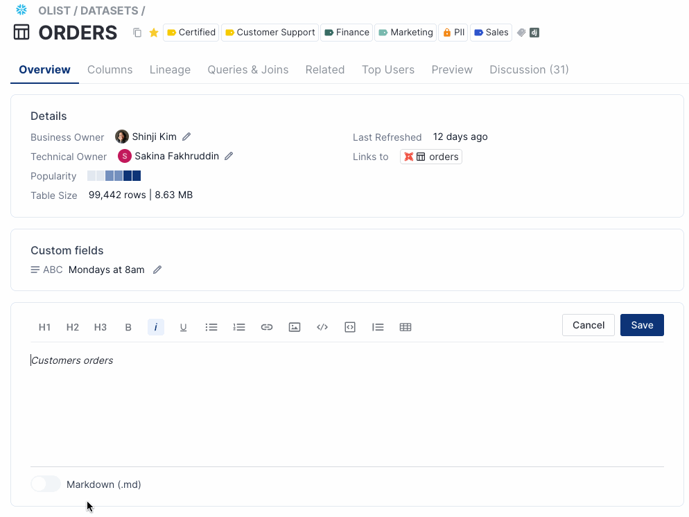 You can also add to and edit documentation easily in Select Star in a few different ways: