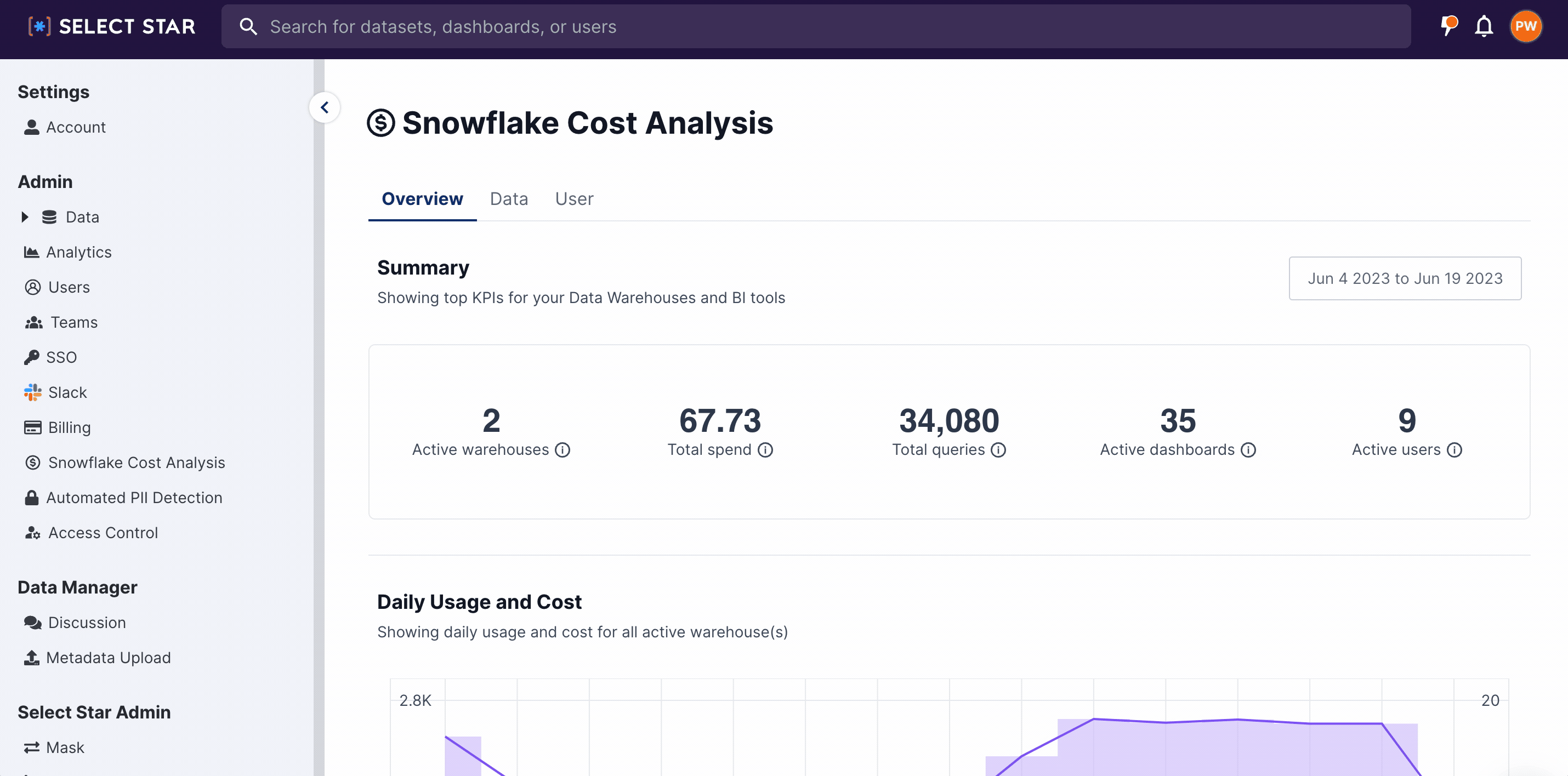 * Data - This tab provides detailed insights on query cost, dashboard cost, and warehouse cost, allowing admins to analyze and optimize resource allocation for efficient cost management.