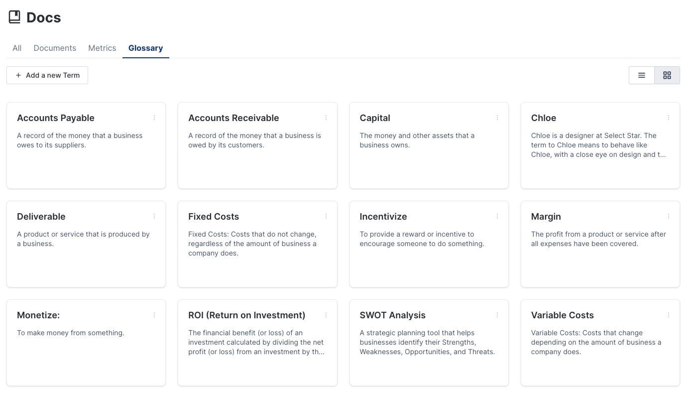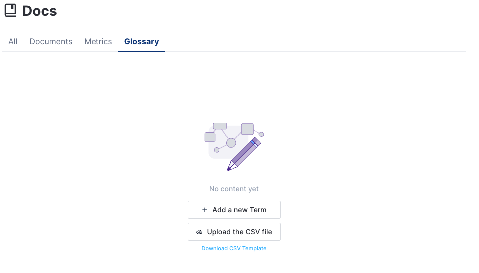Data Managers and Admins can see and create new glossary terms directly in the UI by clicking on Create New Doc > Glossary in the left navigation, or can upload a CSV to create and update terms in bulk.