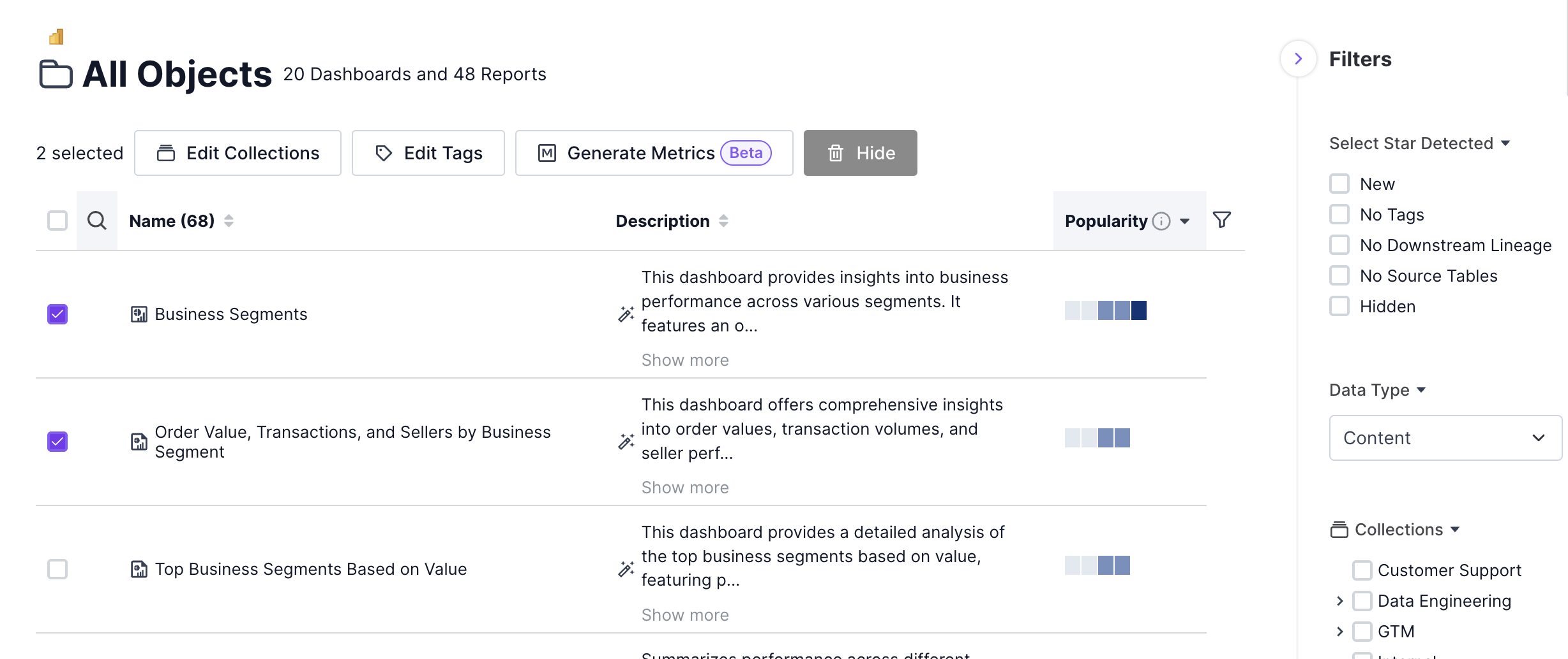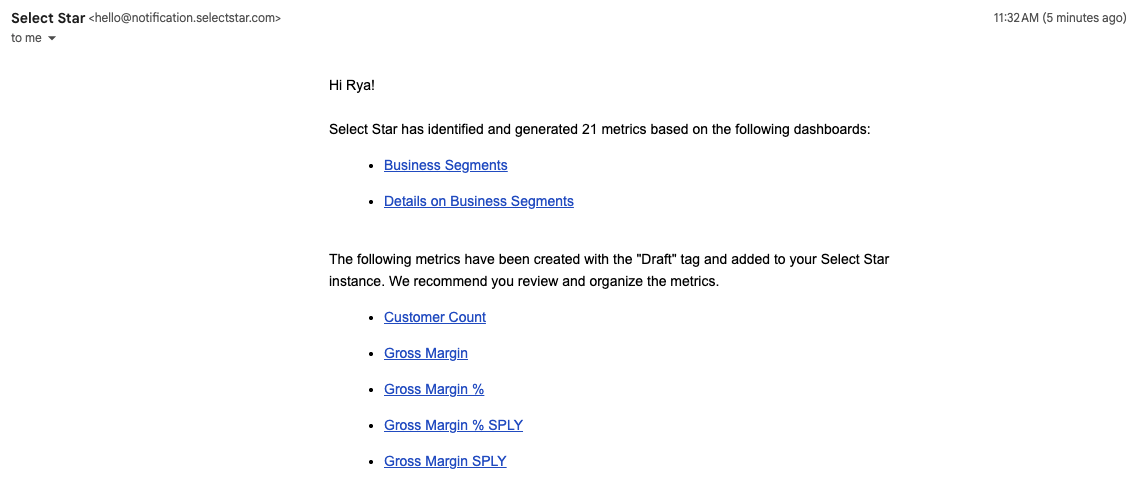 Once metrics are finished generating, you'll receive an email with the generated metrics. We highly recommend you review the generated metrics and organize them into [Collections](https://docs.selectstar.com/data-management/collections) and remove the **Draft** tag when ready.