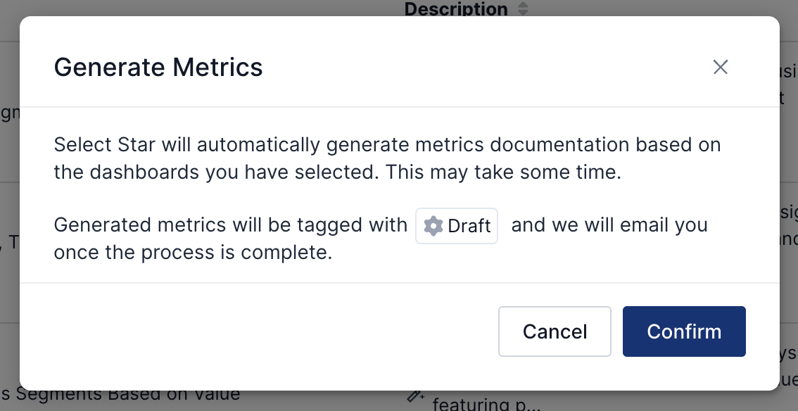 3. Click confirm in the modal. Metrics will be created with the **Draft** tag applied, and you will receive an email summary with metrics that were created.