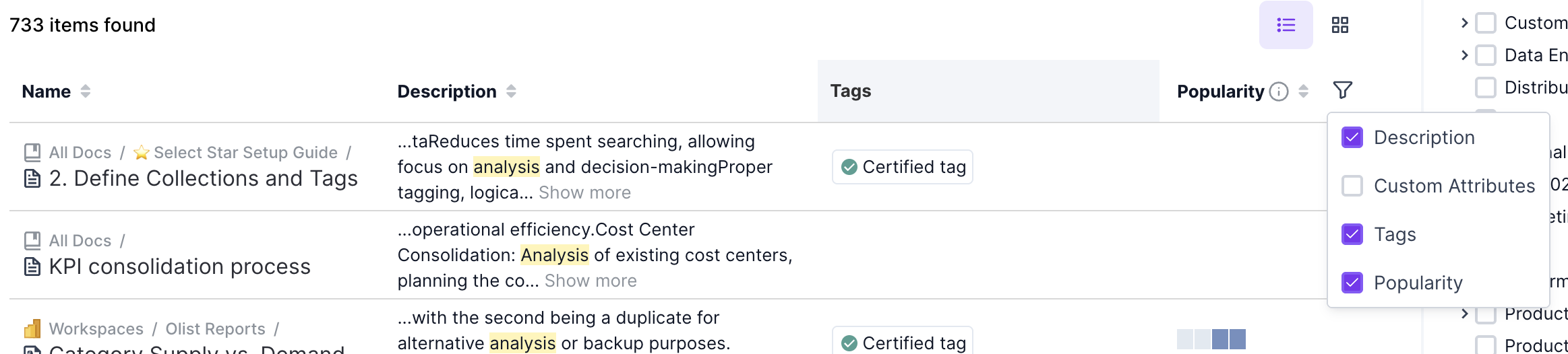 From this view, you can also choose to display or hide other items, such as [Tags](https://docs.selectstar.com/features/tags) and [Owners](https://docs.selectstar.com/data-management/data-ownership), by adjusting the column filters.