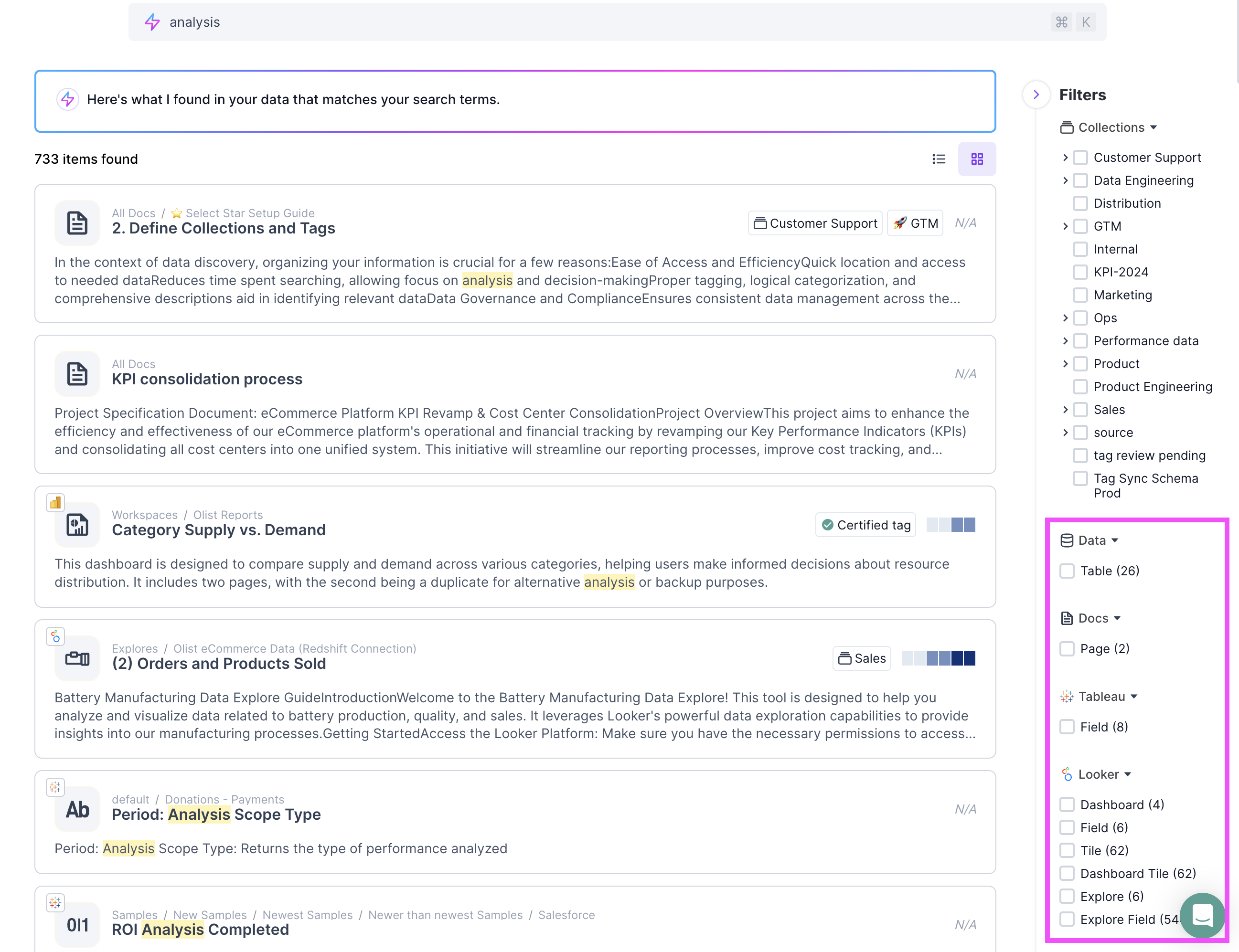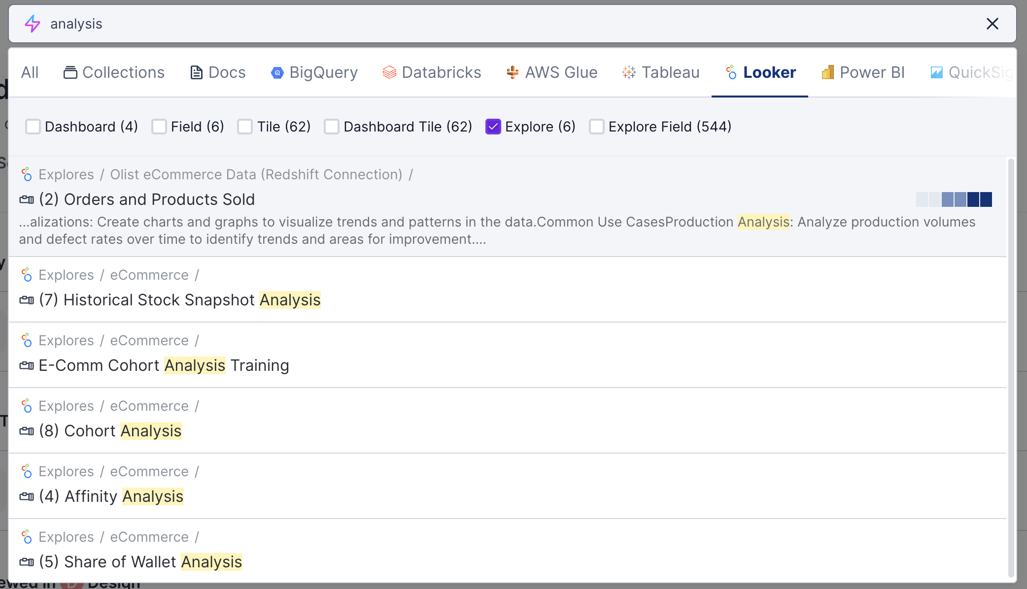 Click on different tabs below the search bar to see results from a specific data source. For instance if you're looking for a Looker Explore, click the **Looker** tab and then select **Looker Explore**.