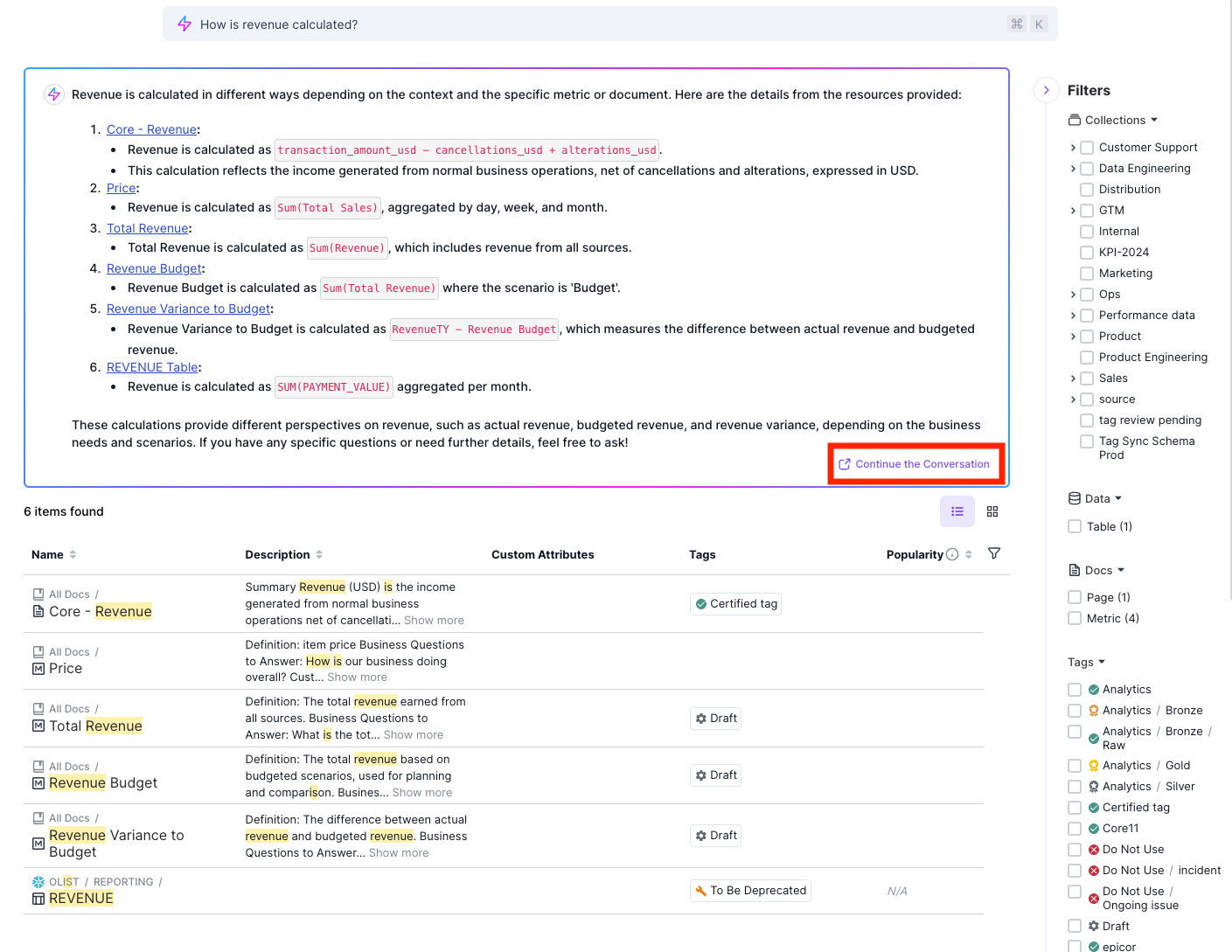 Alongside the search results, NLS displays an AI-generated response similar to a chatbot, summarizing relevant information from the matched data assets. Users can click a “Continue the Conversation” button to ask follow-up questions, enabling a more interactive and conversational search experience.