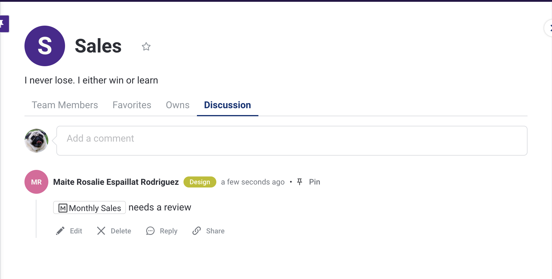 On the Discussion tab, you can leave a comment for that team's members.