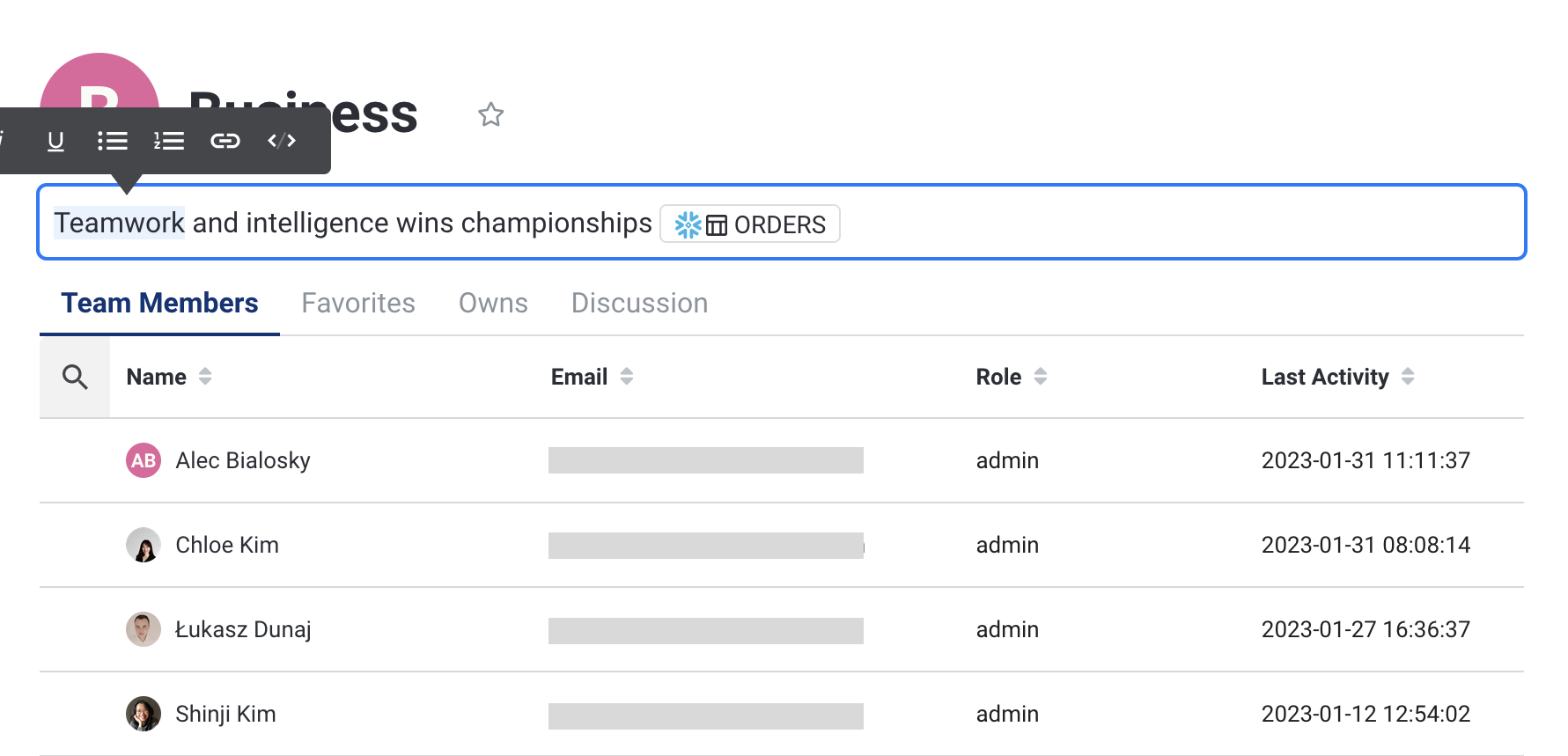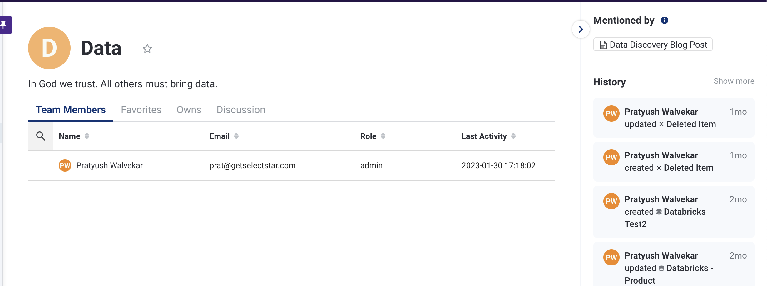 This section shows all the activity on the Select Star platform, for all the team members.