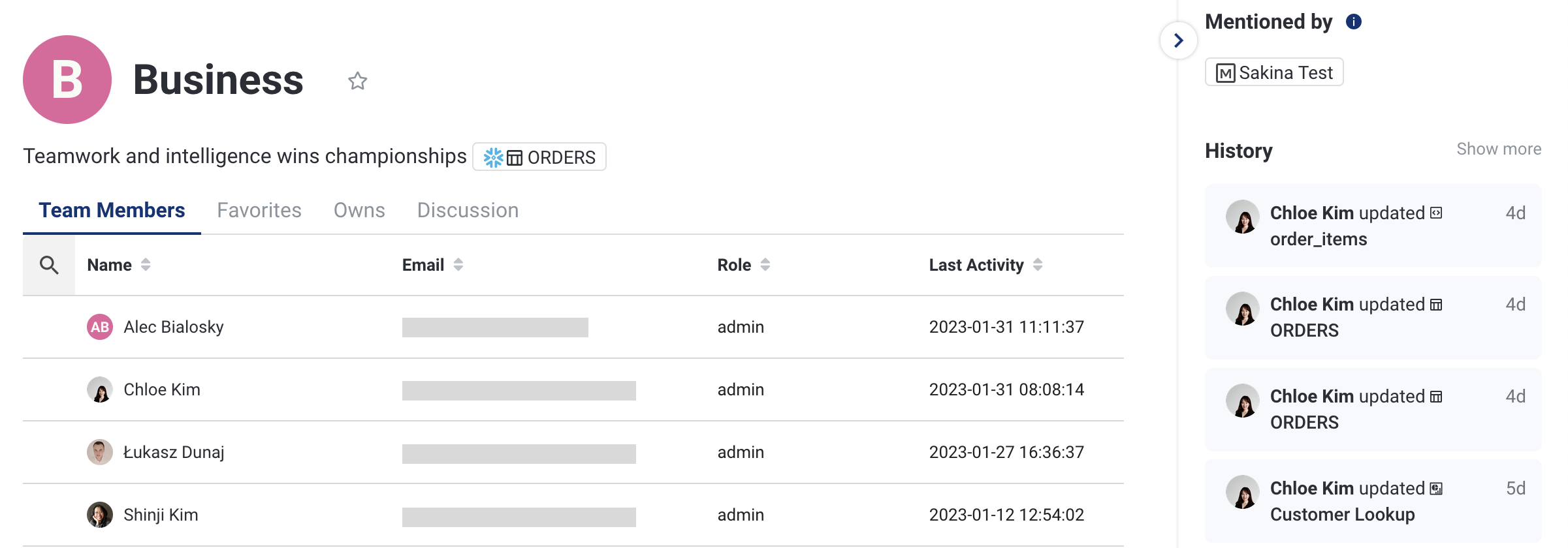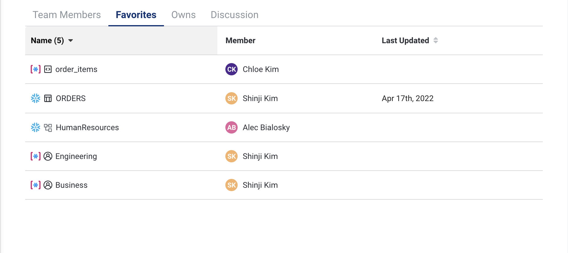 On the Favorites tab, you can see what data assets that team's members have marked as favorites.