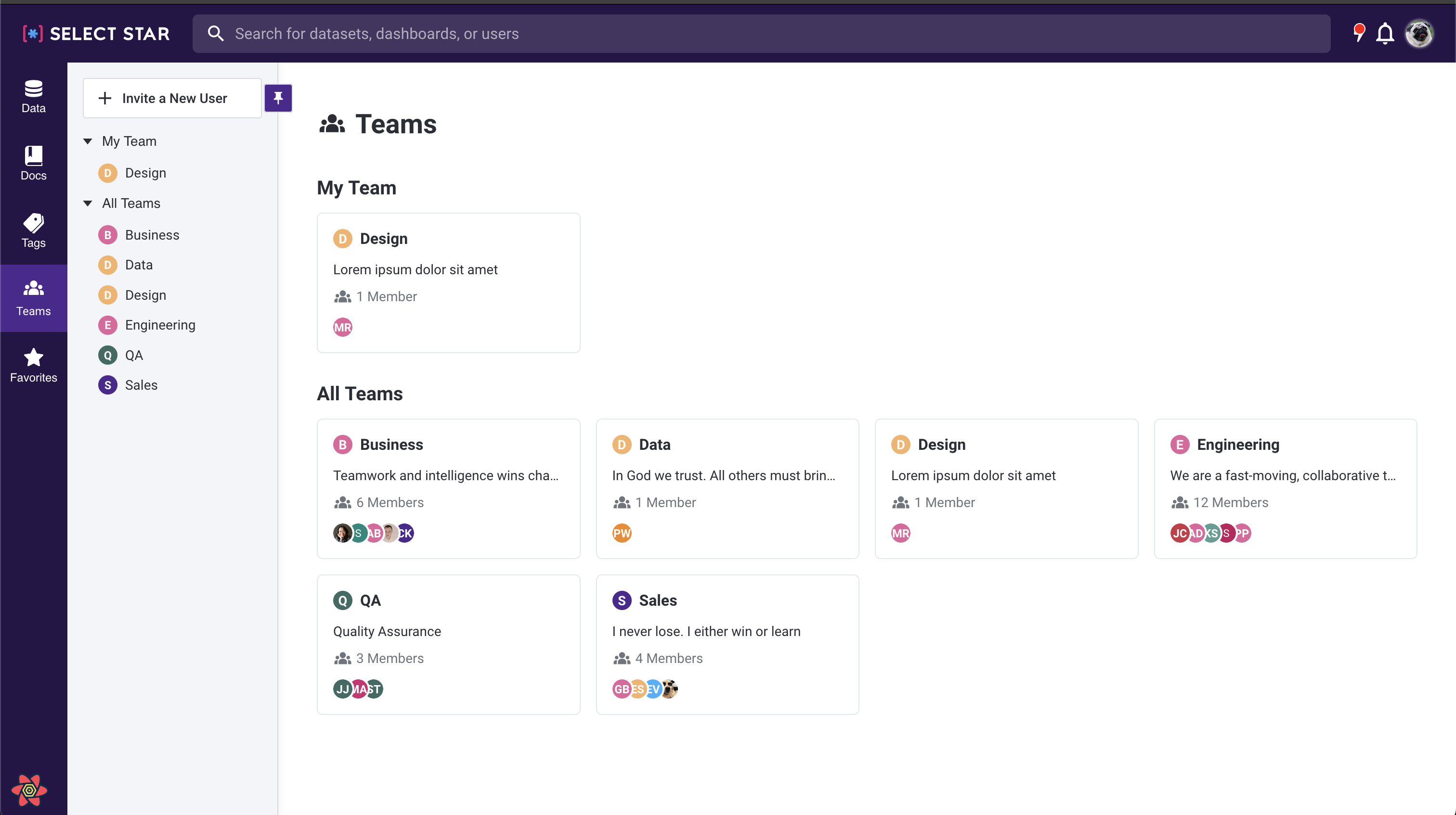 Teams are used to organize your Select Star members and see usage across different cohorts of users. Teams can also be used for defining access policies within Select Star with [Policy Based Access Control](https://docs.selectstar.com/user-management/policy-based-access-control).