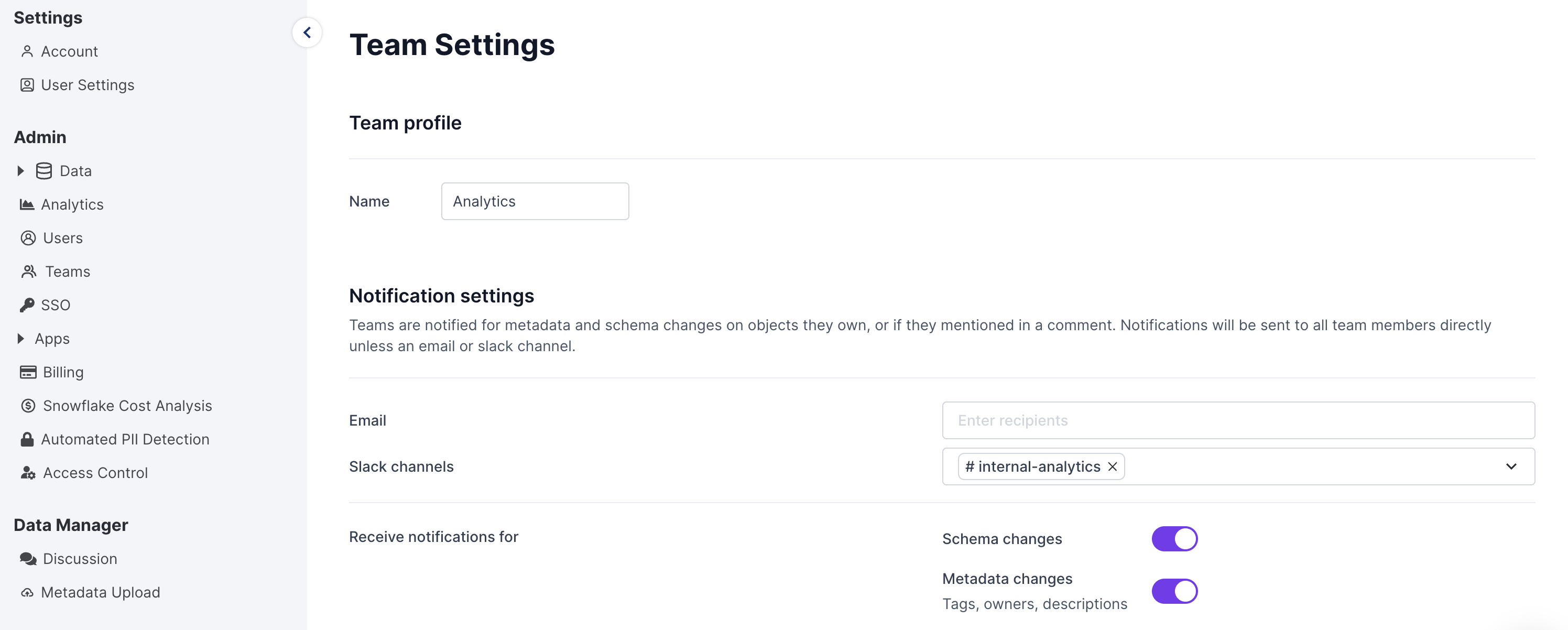 Admins can modify team notifications settings in **Admin** > **Teams.** Usually all members of a team will receive notifications for the team. If an email or slack channel is set to receive notifications for the team, individual team members will no longer be notified directly.