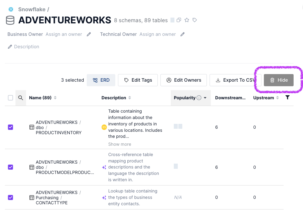 Hide datasets created in personal spaces, or for testing purposes which aren't relevant to the entire company.