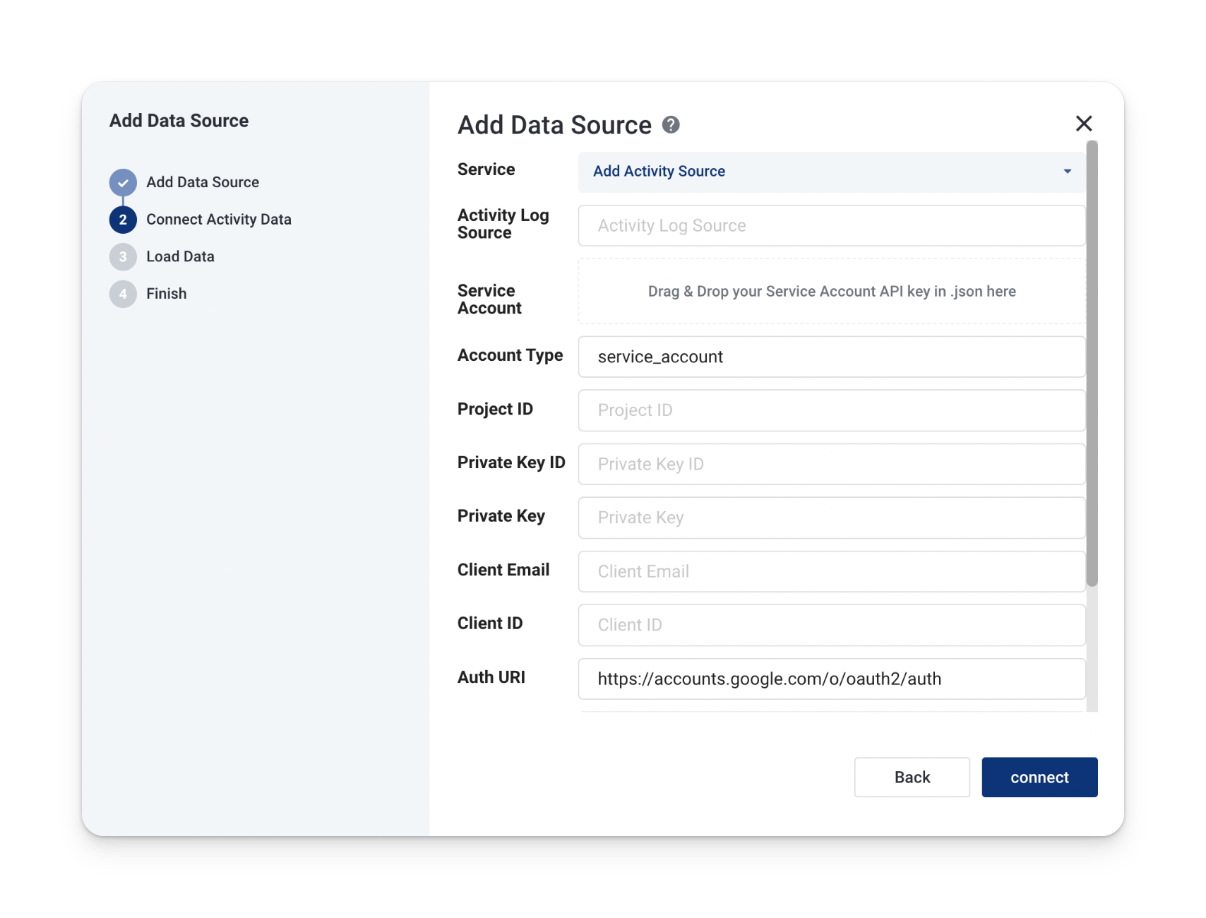 4\. Proceed to next step and select **Add Activity Source** dropdown and fill **Activity Log Source** together with supplying BQ service account json with credentials that you created in [step 3](#3.-setup-gcp-service-account-for-accessing-exports).