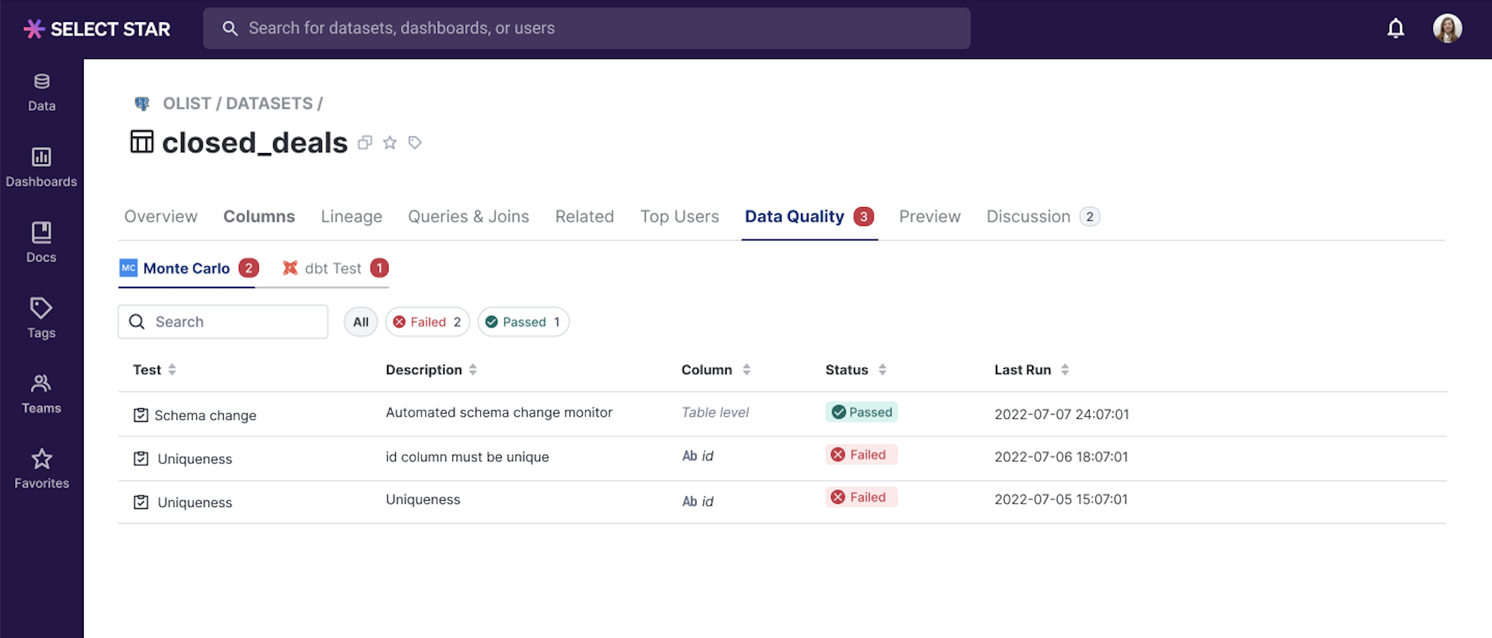 The Monte Carlo integration helps surface data quality information into Select Star, the place most users go to find and discovery datasets and get more context. This integration helps spread awareness of data quality and guides decisions on what data to use.