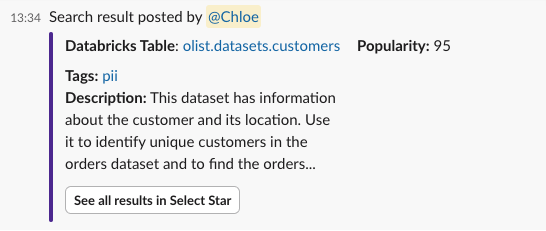 * [**Search Command**](#search-command): Search and post results from Select Star in Slack. You can also specify the type of search results you'd like to see.