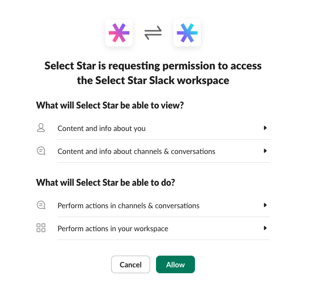 Visit <https://slack.selectstar.com/> and click **Add to Slack.** You'll be redirected Slack in the browser and asked to grant permissions.