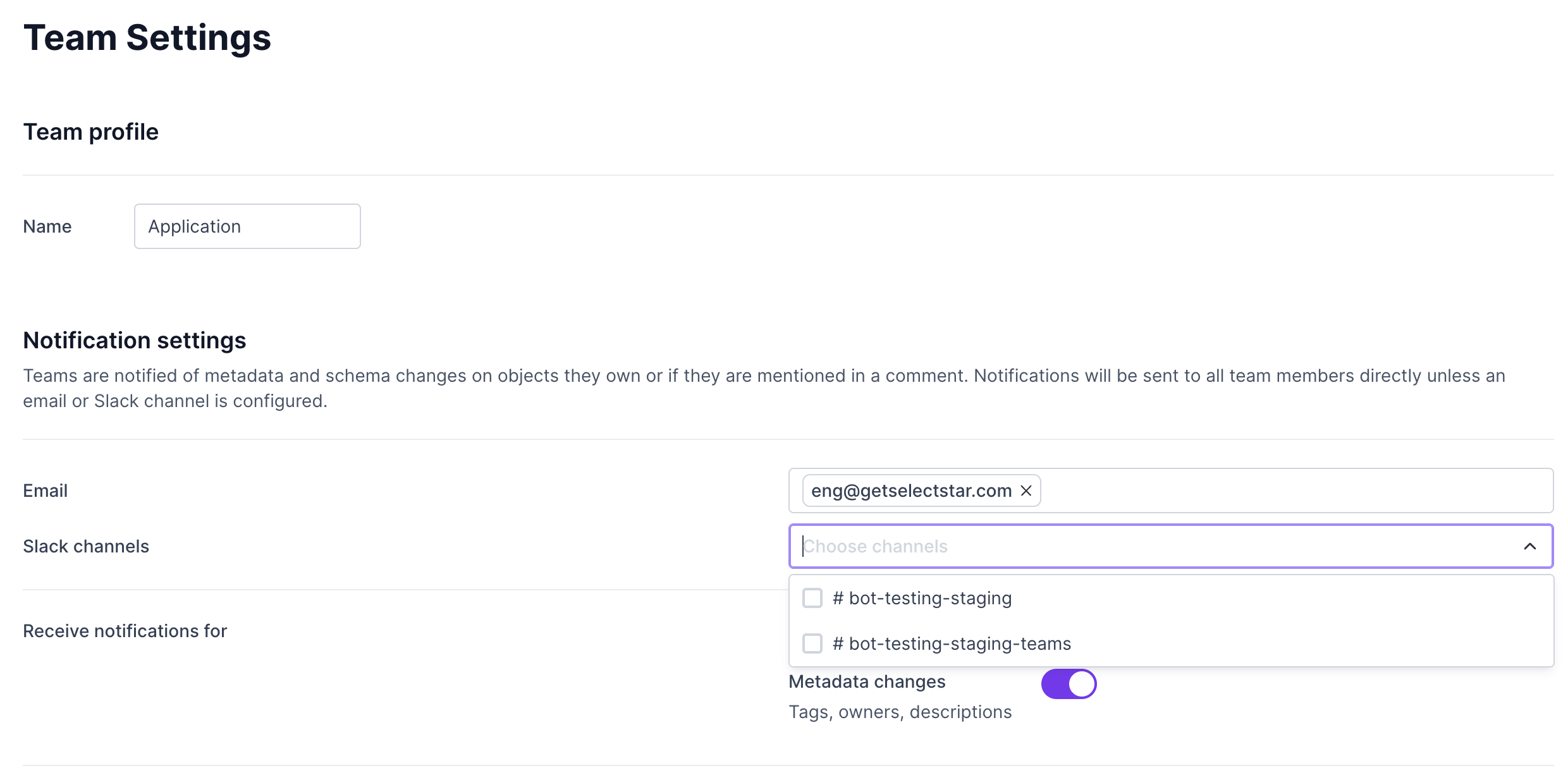Similar to user notifications, admins can configure team notifications to send to a Slack channel. See [Team Notifications](https://docs.selectstar.com/features/teams#team-notifications).