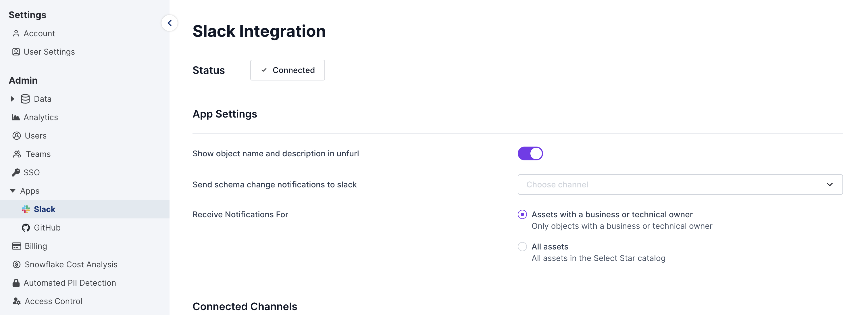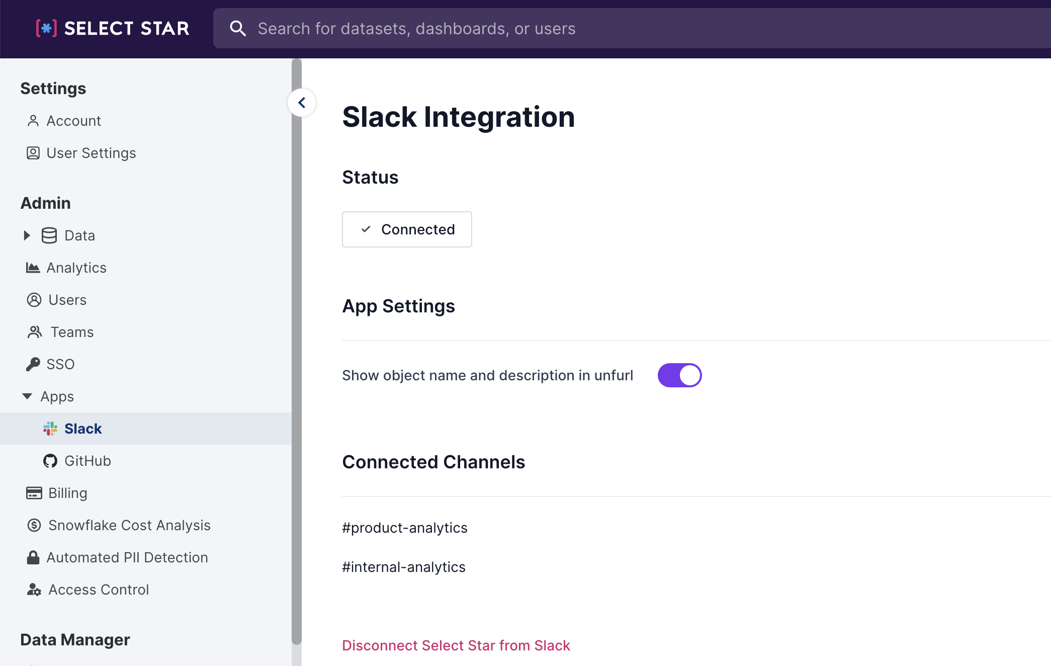 Under **Admin > Apps > Slack** you can see which channels the Select Star Slackbot has been added to and configure unfurl settings for Select Star URLs.