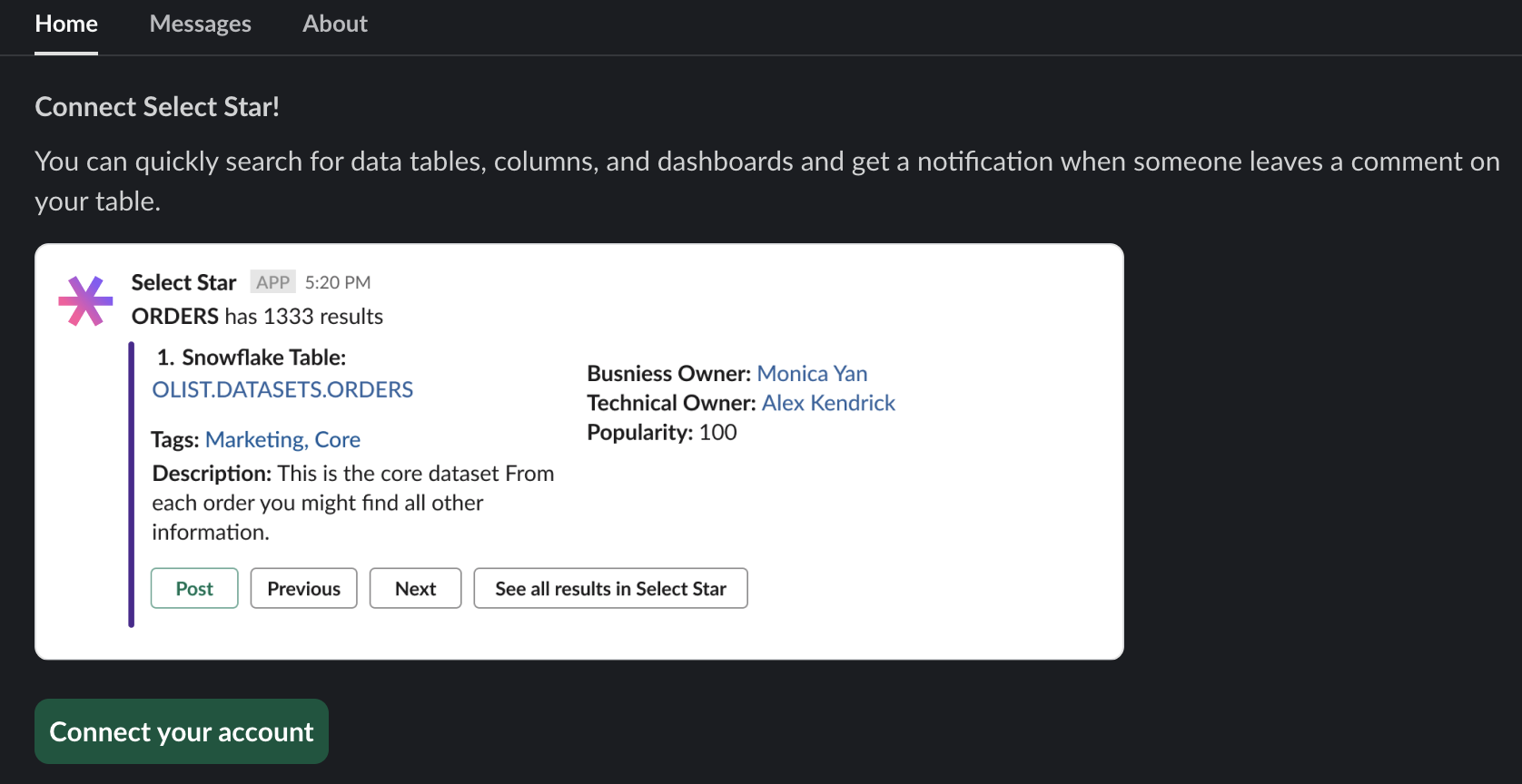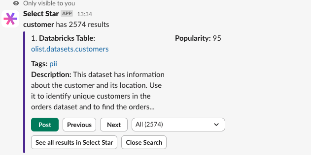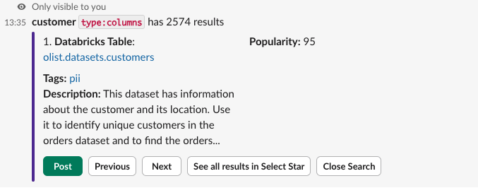 Search results from the Select Star App for Slack will be visible only to you, unless you choose to click the `Post` button, which will share the results to everyone in the channel.