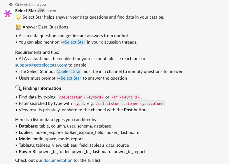 You can type `/selectstar-help` into Slack at any time to see information on how to use the app.