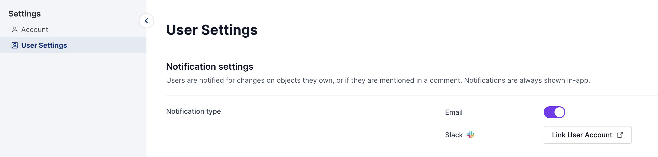 <figure><img src="https://3470314135-files.gitbook.io/~/files/v0/b/gitbook-x-prod.appspot.com/o/spaces%2F-MgAiVthA_yg9UXKuhyY%2Fuploads%2Fgit-blob-9975419b0c026ed61fce1b579cb896ccc89739e5%2Fimage.png?alt=media" alt=""><figcaption><p>User settings to link the user's Slack account to their Select Star account</p></figcaption></figure>