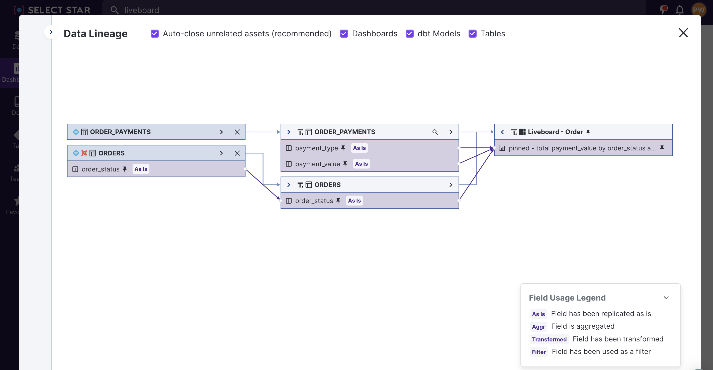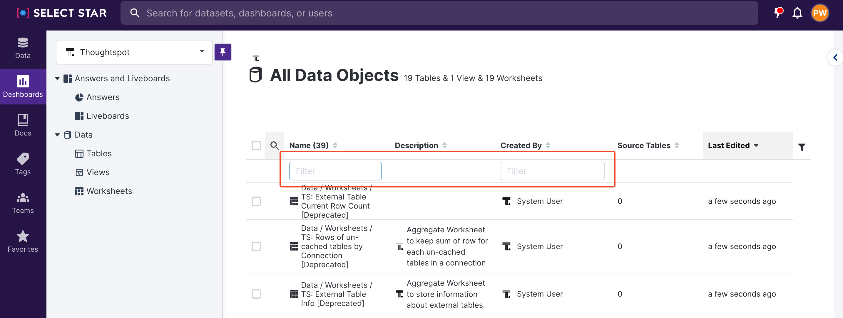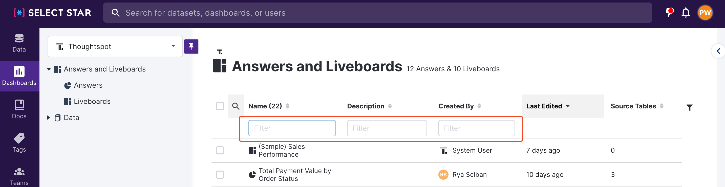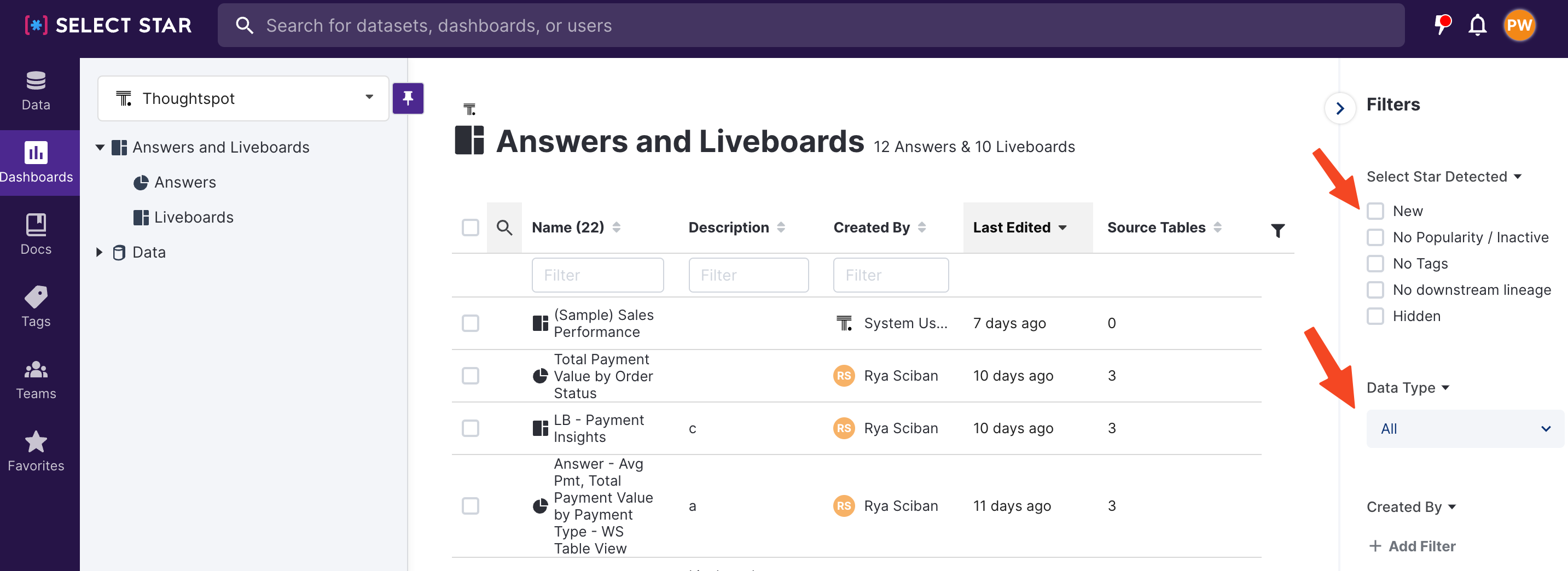You can also use the **Filters** on the right side of the page to change which Answer or Liveboard you see based on [Tags](https://docs.selectstar.com/data-management/tag-management), created by and more.​