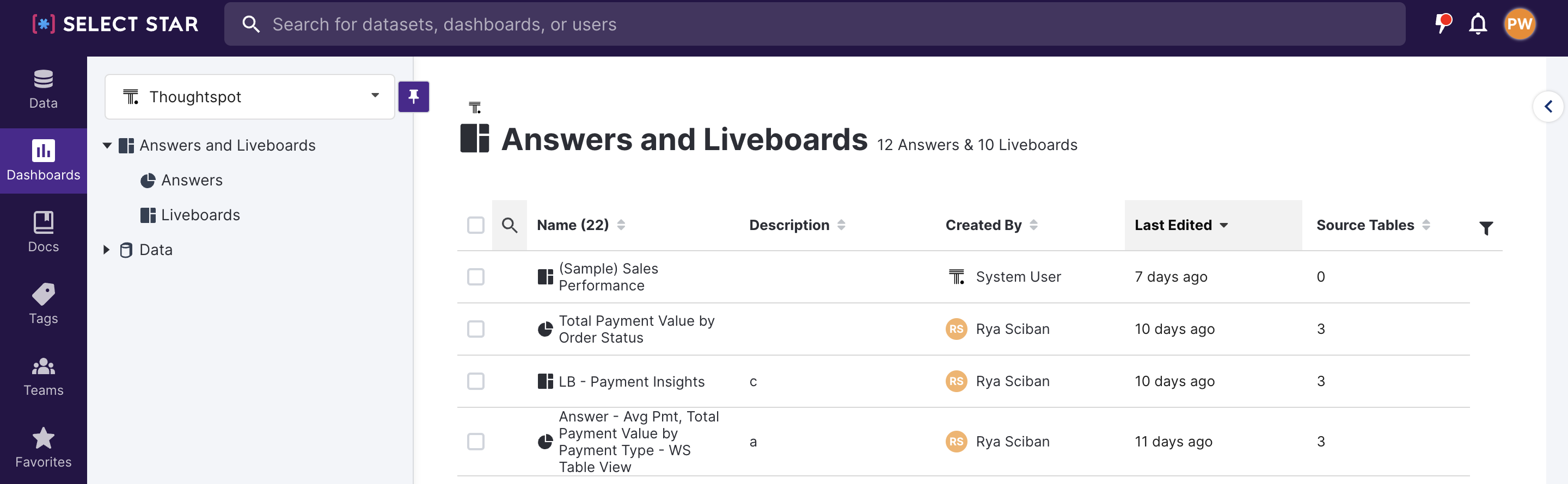 In the left sidebar under **ThoughtSpot**, click **Answers and Liveboards or Data** to see all your liveboards, answers, tables, views and worksheets, ordered by Last Edited.