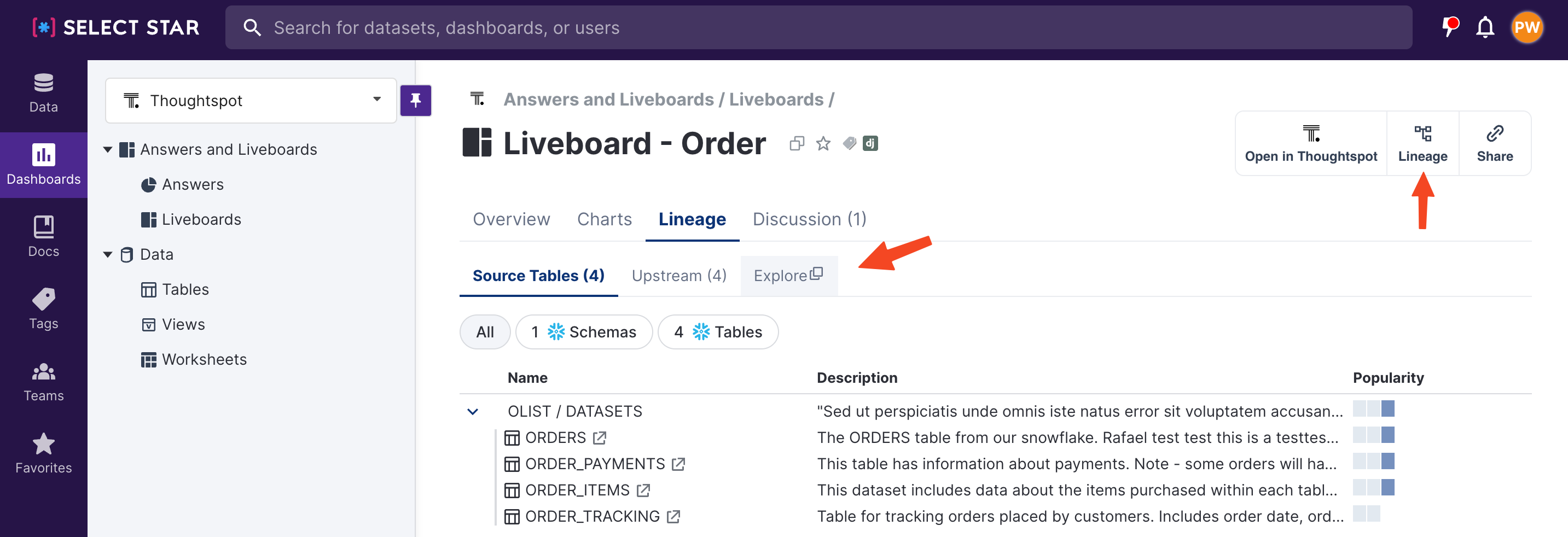 Use the Lineage button on the top right or the Explore button to open the Data Lineage modal.
