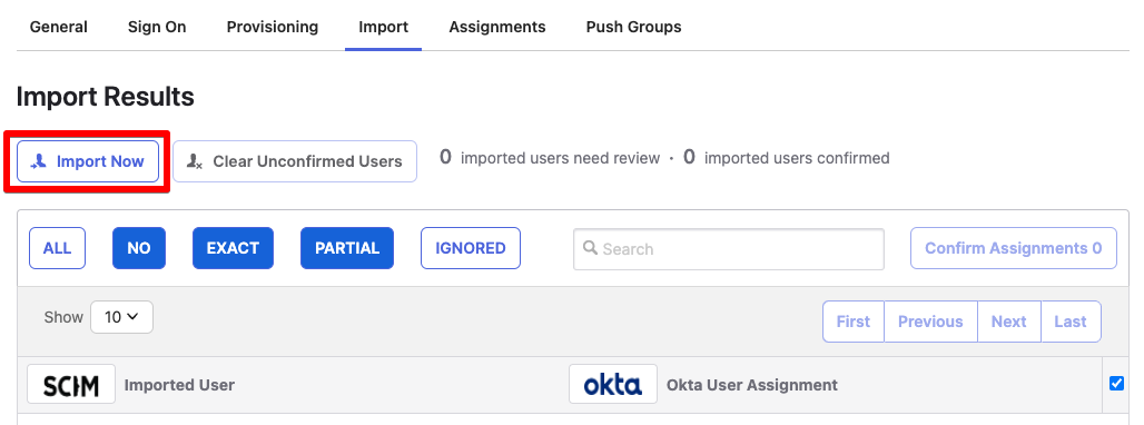 Head to **Applications > Applications,** select the SCIM app and go to the **Import** tab. Select **Import Now**.