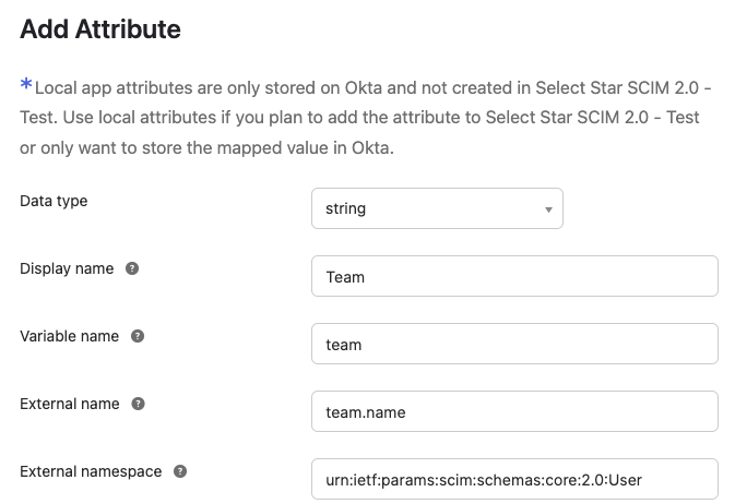 If you want to map team from Okta into Select Star (and it does not already exist in your Okta user profile), add it as a string: