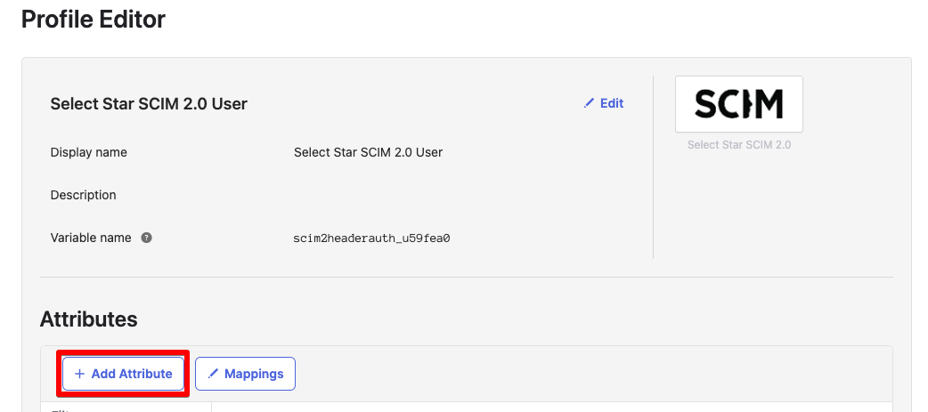 Next, add the fields you want to map into Select Star to the SCIM app. You can do this in the profile editor by going to **Directory > Profile Editor** in the left navigation, selecting the SCIM app and select `+ Add Attribute`**.**