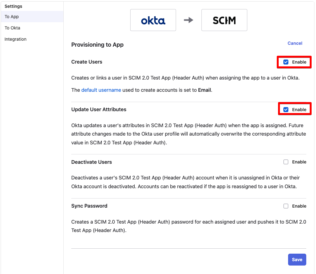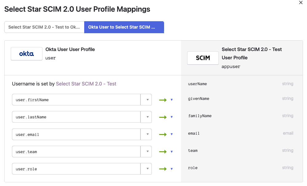 Once the attributes exist in both the Okta user profile as well as the SCIM app, you can map the two together. You need to do this in both directions, from Okta to the app, and from the app to Okta.