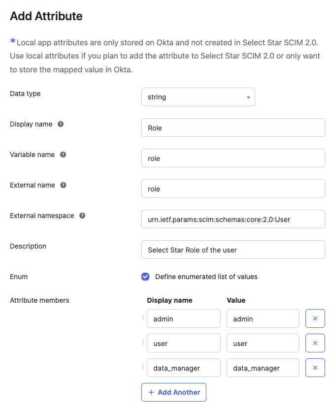 If you want to map role from Okta into Select Star, add role as an enumerated list of values: