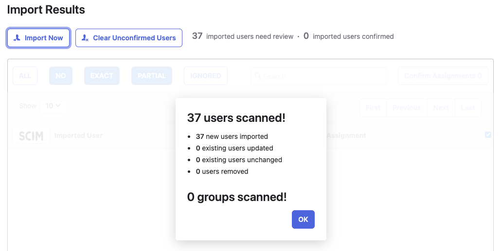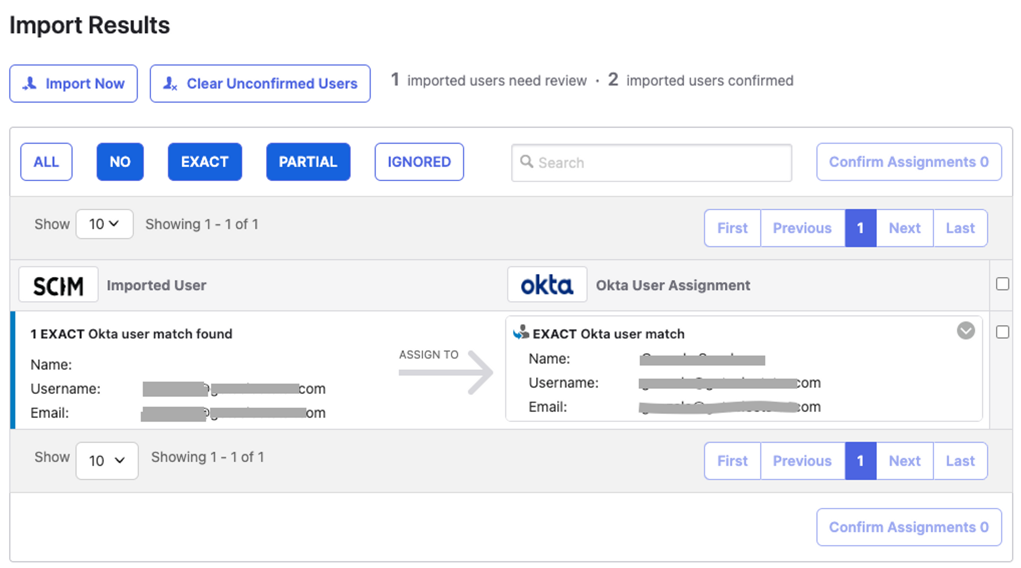 Now you can view the external users found, import or map them to existing Okta users, and assign the app to them. In Okta, you can choose whether imported users are matched to an existing Okta user, creating a new Okta user, or ignored.