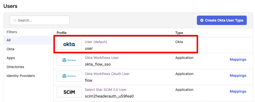 If the values you want to map do not already exist as an attribute in the Okta user profile, you must add them now. Head to **Directory > Profile Editor** and select Okta.